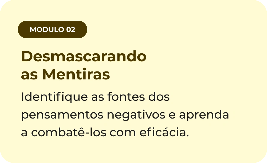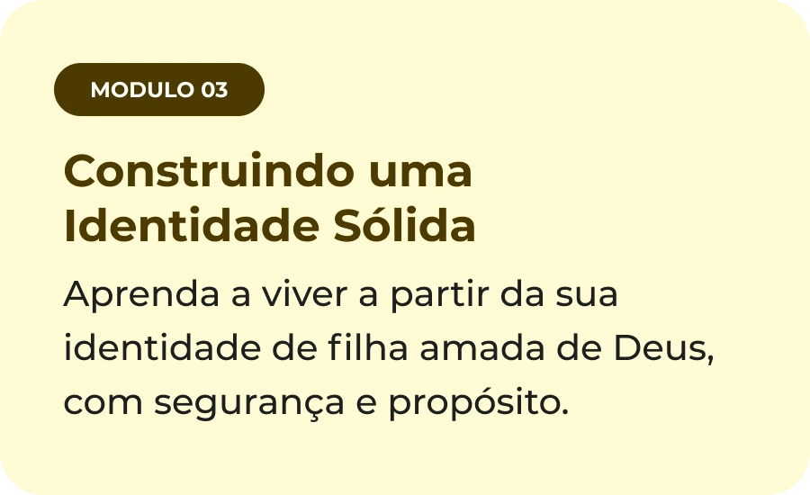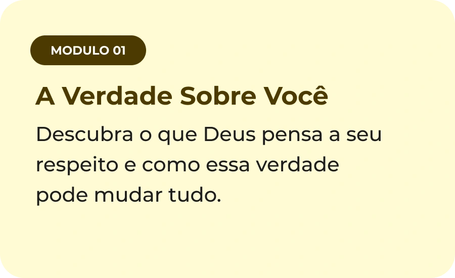 Neste itinerário online, com aulas curtas e diretas, você vai aprender a combater as mentiras que o mundo e você mesma contaram sobre quem você é. Você vai descobrir as raízes da sua baixa autoestima e receber as ferramentas para construir uma autoimagem sadia e equilibrada, fundamentada no amor de Deus.